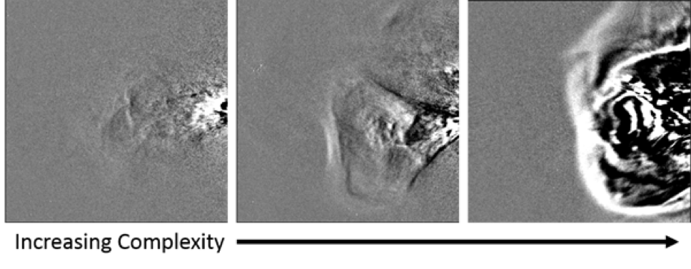 We created a Zooniverse citizen science project in collaboration with the UK Science Museum called ‘Protect our planet from solar storms’, where we showed pairs of images of CMEs from the Heliospheric (wide-angle white-light) Imagers on board the twin STEREO spacecraft, and asked participants to decide whether the left or right CME looked most complicated, or complex (Jones et al. 2020) We used these data to rank 1,110 CMEs in order of their relative visual complexity, by fitting a Bradley-Terry model. This is a statistical model widely used by psychologists to rank items by human preference. Figure 1 shows three example storms from across the ranking (see figshare for an animation with all CMEs). When we asked the citizen scientists how they chose the most complex CME, they described complex CMEs as “big”, “messy” and “bright” with complicated “waves”, “patterns” and “shading”.
