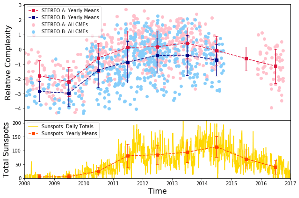 Figure 2 shows the relative complexity of all 1,110 CMEs, with CMEs observed by STEREO-A shown by pink dots, and CMEs observed by STEREO-B shown by blue dots. The lower panel shows the daily sunspot number over the same time period, using data from SILSO World Data Center. This shows that the annual average complexity values follow the solar cycle, and that the average complexity of CMEs observed by STEREO-B is consistently lower that the complexity of CMEs observed by STEREO-A. This might be due to slight differences between the imagers: STEREO-B is affected by pointing errors, which might blur smaller-scale features within the images.