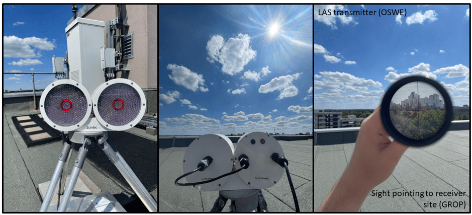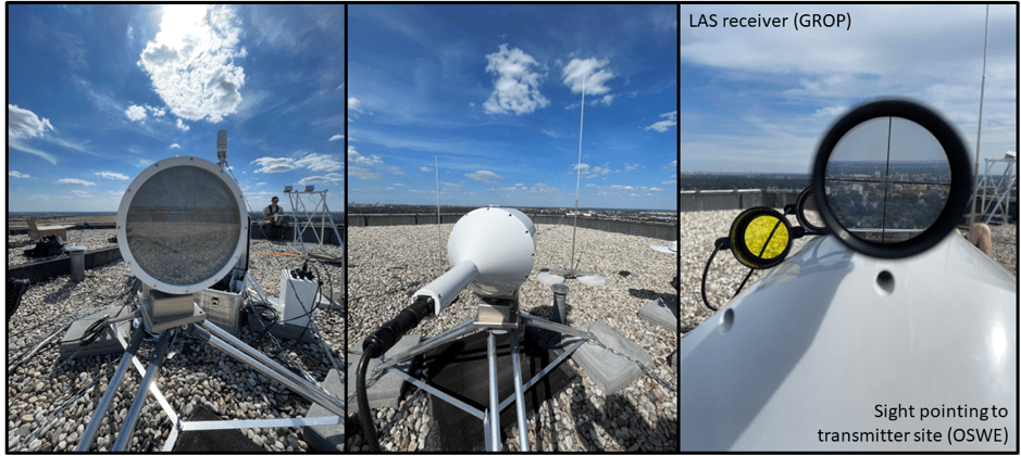The Berlin field campaign has included 6 LAS paths (Fig. 1). LAS paths consist of a transmitter and receiver mounted in the free atmosphere (Fig. 2), 0.5 – 5 km apart (e.g. Ward et al. 2014).
