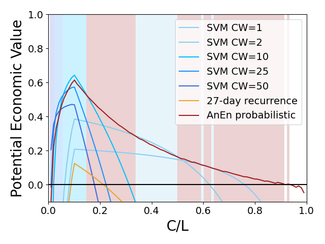 Figure 3 shows the potential economic value (PEV) of the SVM with a range of class weights (CW), probabilistic AnEn and 27-day recurrence. The shaded regions indicate which hindcast has the highest PEV for that Cost/Loss ratio. The probabilistic AnEn has the highest PEV for the majority of the Cost/Loss domain although SVM has higher PEV for lower Cost/Loss ratios. It highlights that the `best’ hindcast is dependent on the context in which it is to be employed.