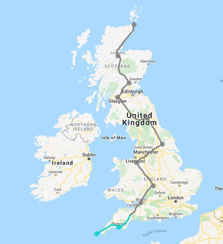 Fig 3 – Using World Walking to track the distance, we intended to collectively walk the 1576km (or 2,299,172 steps) from Land’s End to John O’Groats. This may have been an optimistic endeavour as we only achieved 235km (343, 311 steps).