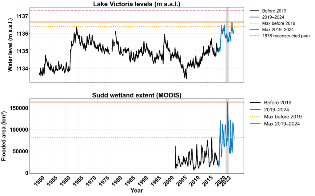 Between 2019 and 2024, both Lake Victoria and the Sudd reached record levels. Lake Victoria exceeded its historic 1964 peak in 2020, 2021, and 2024, while the Sudd expanded to more than twice its previous maximum extent. Each year from 2019 to 2024 stayed above any pre-2019 record, revealing that this was not a single flood season but a sustained multi-year regime.