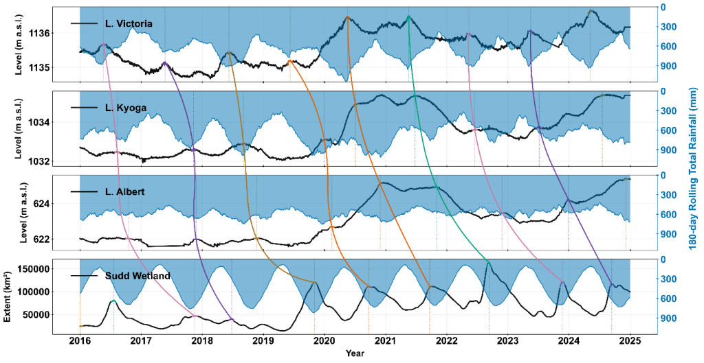 Our recent study challenged that assumption. By combining daily lake-level and discharge data (1950–2024) with CHIRPS rainfall and MODIS flood-extent records (2002–2024), we tracked how flood peaks propagated through the system, segment by segment. Using an automated peak-matching algorithm, we quantified the lag between successive annual maxima peaks in Lake Victoria, Lake Kyoga, Lake Albert, and the Sudd Wetland.