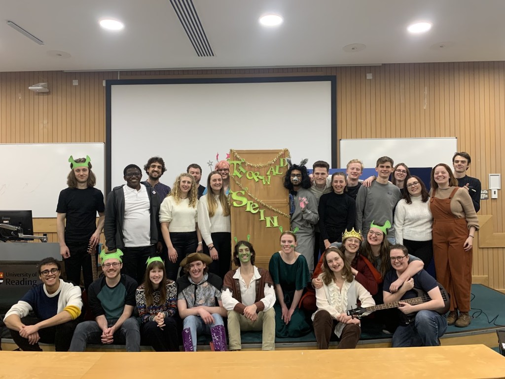 Tickets had been sold (about 150 of them!). Props had been made, songs had been practised. The backstage cupboard was full, Robby’s face had been painted green. The cast were assembled and waiting at 5pm sharp. But wait – who was this in the Madejski lecture theatre? Surprise! An unexpected law lecture until 6pm!