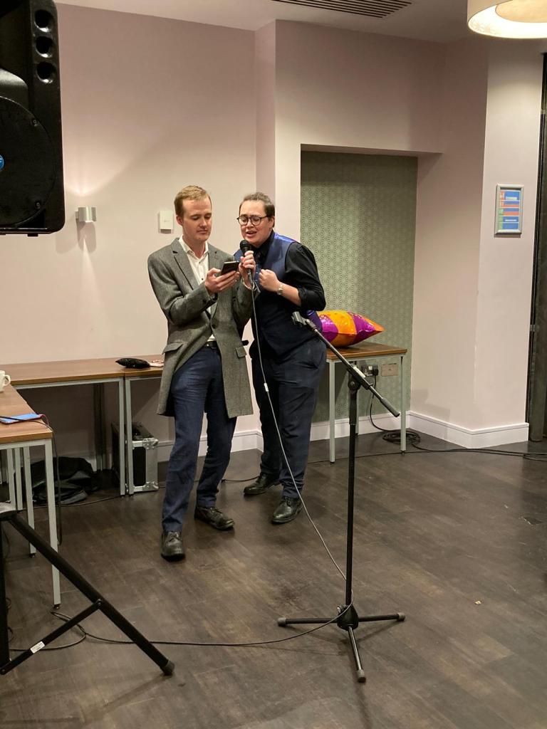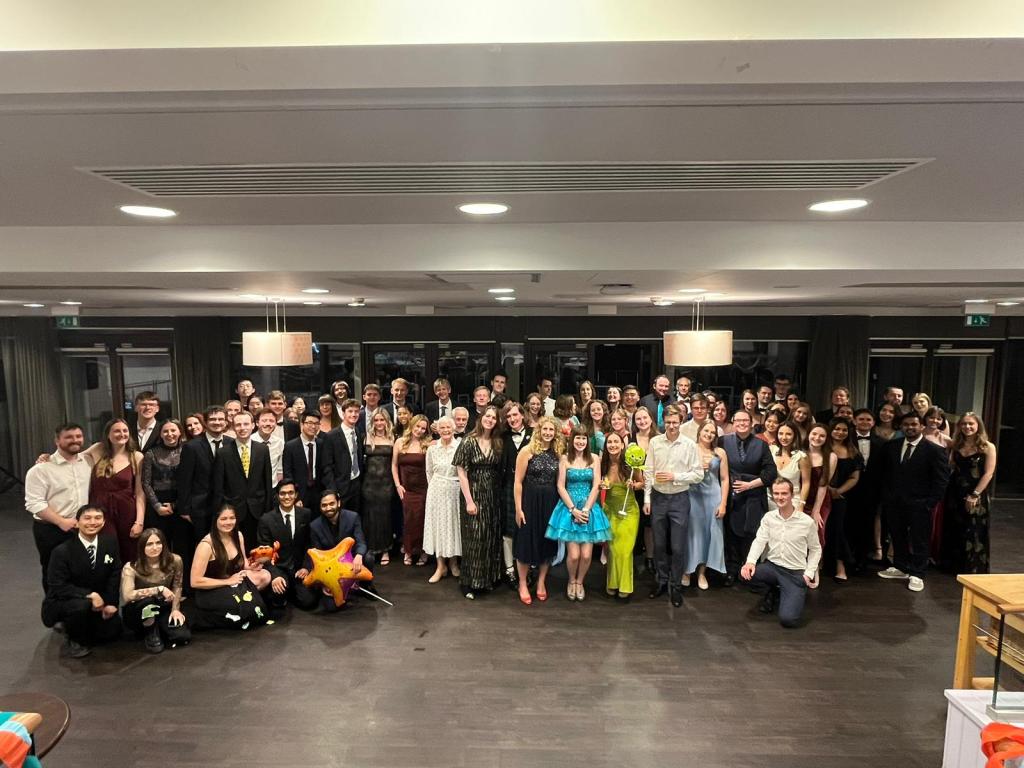 With the doors due to open at 7pm, we were feeling the pressure. Thankfully, due to a fair amount of preparation earlier in the day between lectures, many of the time- consuming tasks like setting the band up had already been done. With all hands- on deck and some tactical delaying of the audience (by keeping them by the buffet for longer) we were ready to go by 7.15.